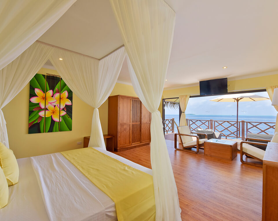 Overwater bungalows presents mesmerizing views of endless blue sky and ocean. As dusk approaches, the sun sets with a display of violet, crimson and golden hues best enjoyed from the wooden deck. Access the lagoon directly from your villa for a cooling dip or snorkel, any time you desire.